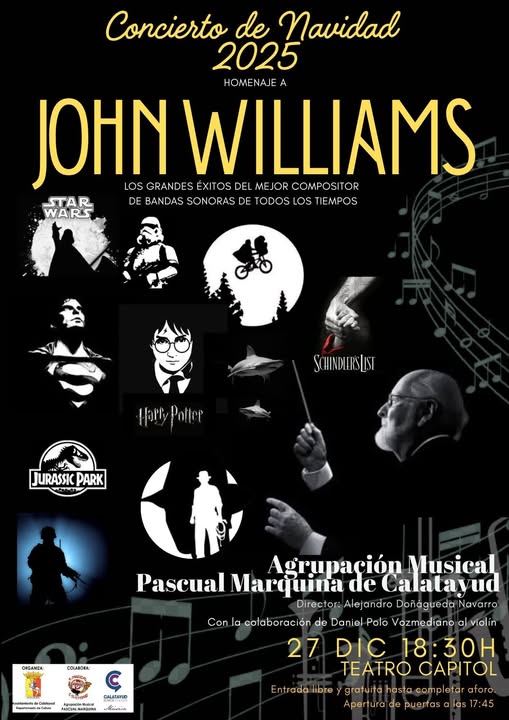 Ya tenemos cartel para nuestro próximo concierto de Navidad. Será el sábado 27 de diciembre a las 18:30 en el Teatro Capitol de Calatayud. Este año rendiremos a uno de los compositores de bandas sonoras mas grande de todos los tiempos, JOHN WILLIAMS. Melodías de Star Wars, Indiana Jones, Superman, Harry Potter, E.T., Parque Jurásico….. y muchas mas que harán que pasemos una tarde de película. No os lo podéis perder.