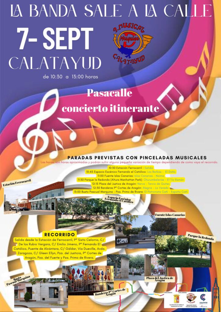 Este año nuestro concierto de ferias lo sacamos a la calle. Coincidiendo con el tradicional homenaje a nuestro ilustre compositor Pascual Marquina, el domingo 7 de septiembre realizaremos nuestro concierto en diferentes rincones de nuestra ciudad. Comenzaremos a las 10:30 desde la Estación de tren recordando cuando Pascual Marquina llegaba a nuestra ciudad con su banda de ingenieros y desde allí desfilaban hasta el centro de la ciudad. Nosotros desfilaremos y nos dirigiremos al Espacio Escénico del Parque Fernando el Católico donde interpretaremos dos obras, de allí a la fuente de las Islas Canarias. Continuaremos al Parque de la Redonda para salir por la Avenida Zaragoza y la Calle Gleen Ellyn al Paseo Cortes de Aragón donde con sendas paradas en la Plaza del Justicia y en las Banderas, finalizaremos el recorrido en el busto de Pascual Marquina en la Plaza Primo de Rivera. En cada uno de estos sitios interpretaremos dos obras, pasodobles para ser mas concretos. A lo largo de todo este recorrido podremos disfrutar de diferentes tipos de pasodobles: de marcha, de concierto, taurinos, festeros, todos ellos para finalizar con el mejor pasodoble compuesto y a la postre mayor veces interpretado en el mundo, España Cañí de nuestro paisano Pascual Marquina. No os lo perdáis y acompañar a vuestra banda por las calles de la ciudad, seguro que merece la pena.
